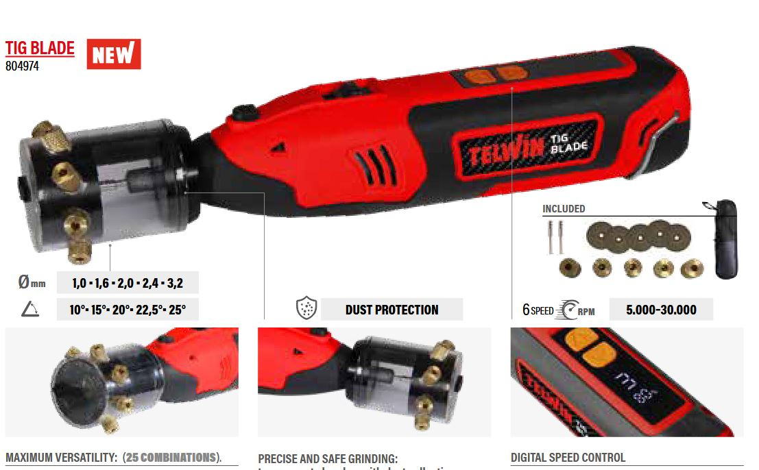 Prenosni brusilnik Telwin TIG Blade omogoča hitro in natančno brušenje volframovih elektrod, ki se uporabljajo priTIG varjenju, tako v delavnici kot na terenu.