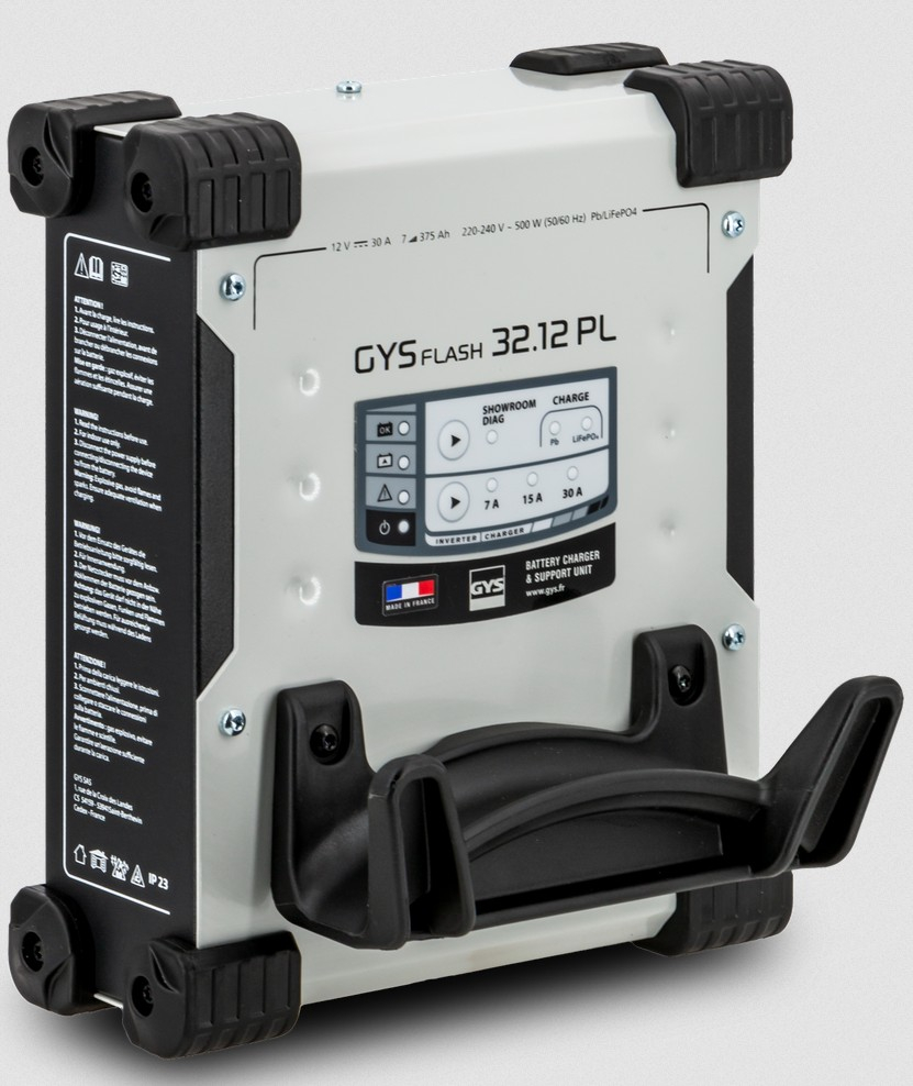 GYSFLASH vertical 32.12 PL je 30 A večnamenski polnilec za 12 V svinčene in litij-železo-fosfatne baterije (LiFePO4), ki je posebej zasnovan za namestitev na steno ali dvigalo.Njegov način "Showroom/Diag" omogoča varno napajanje vozil v avtomobilskih salonih ali v fazi diagnostike.